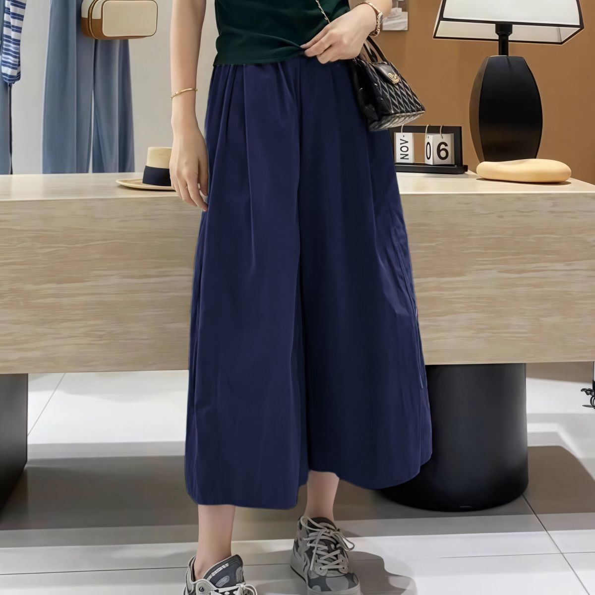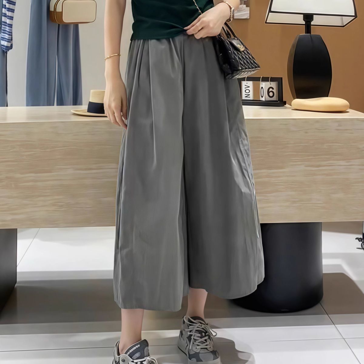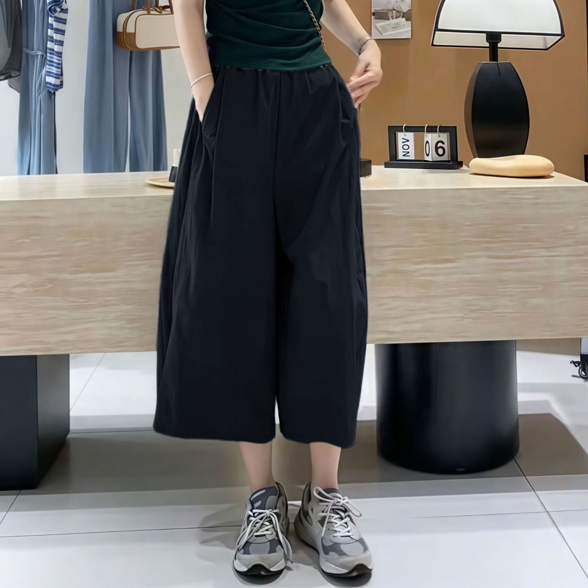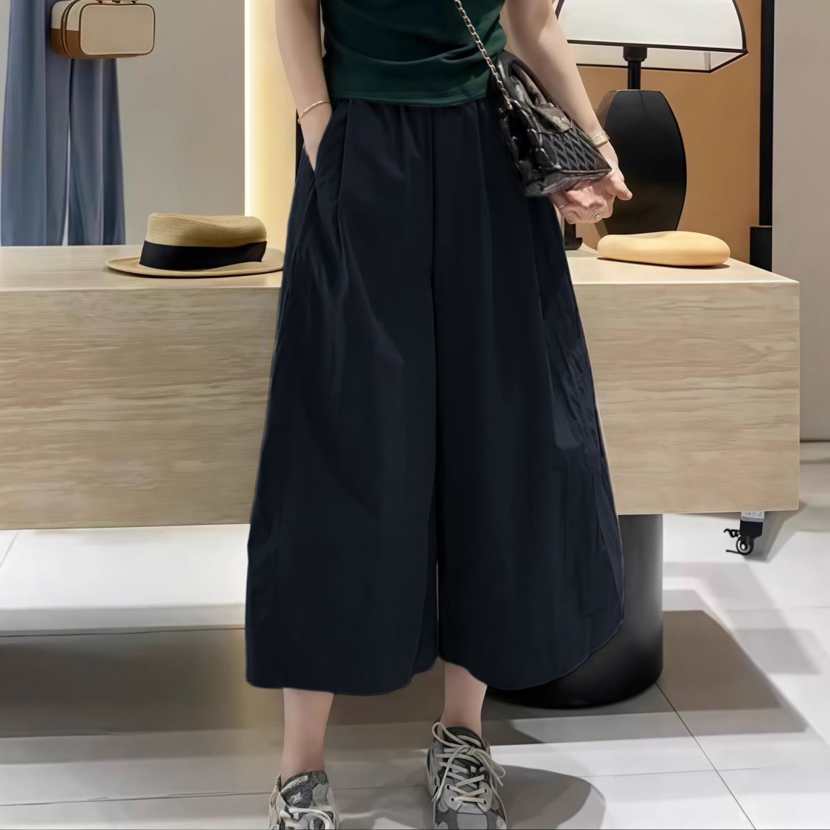 日系素色百搭過膝寬鬆顯瘦七分闊腿褲