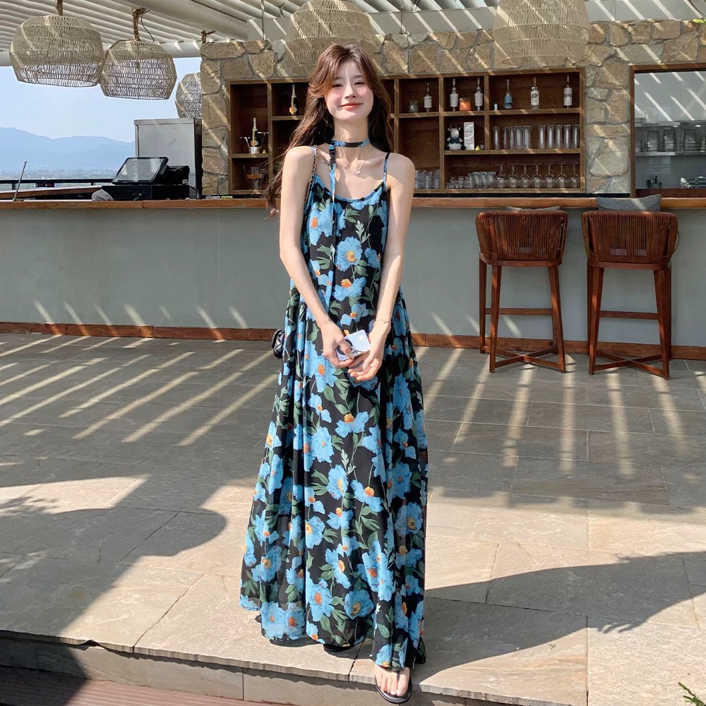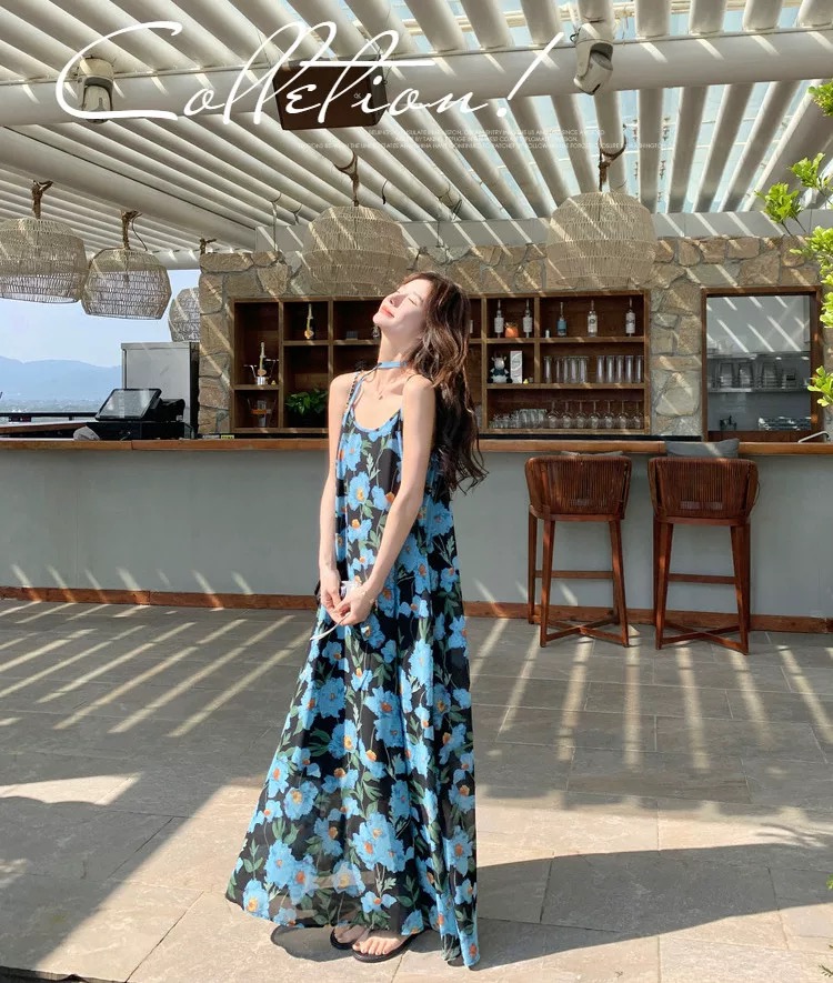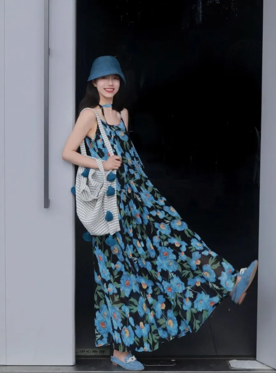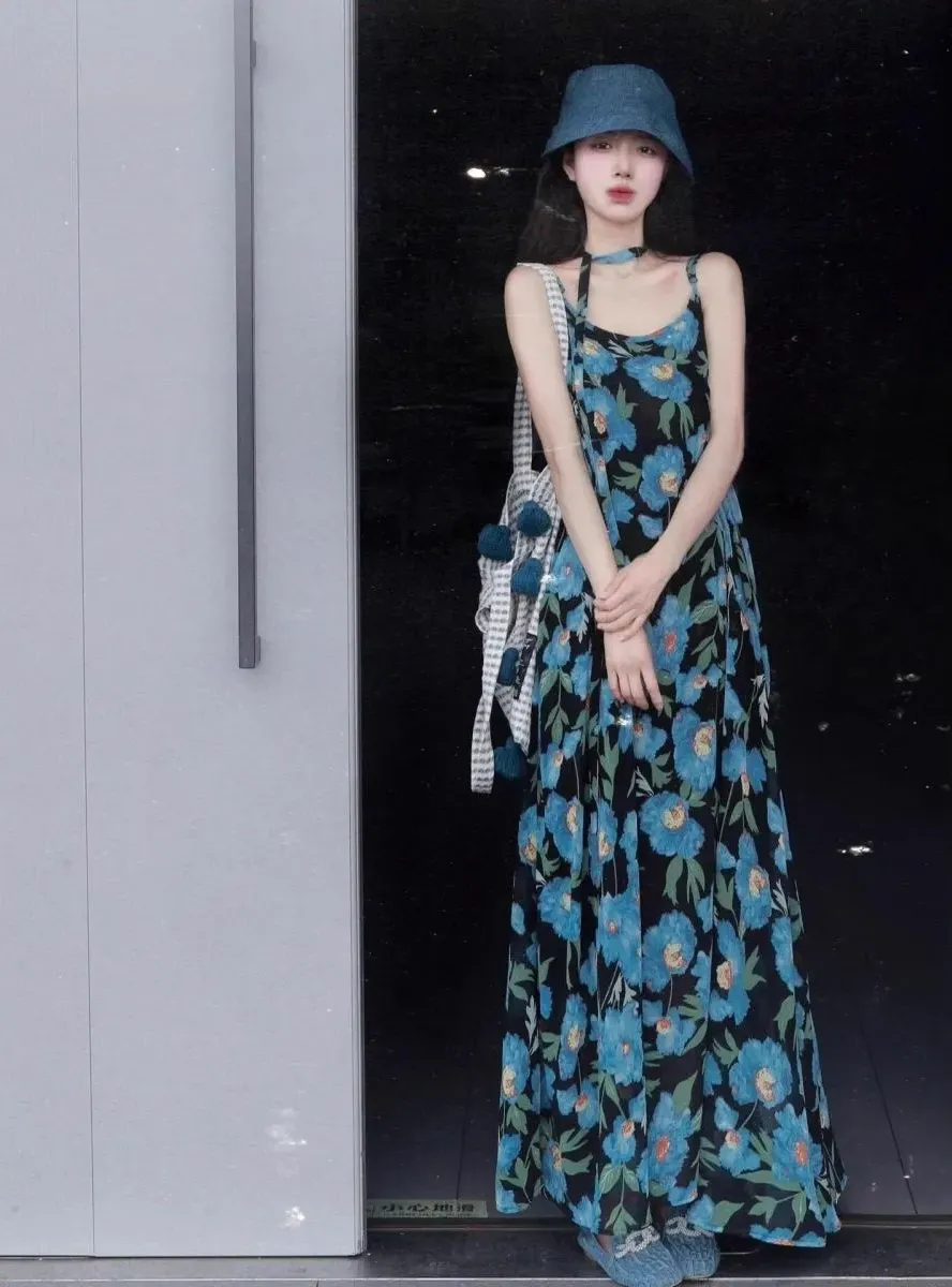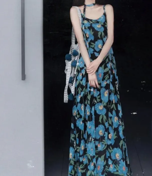 法式度假質感高級感藍色花無袖吊帶洋裝
