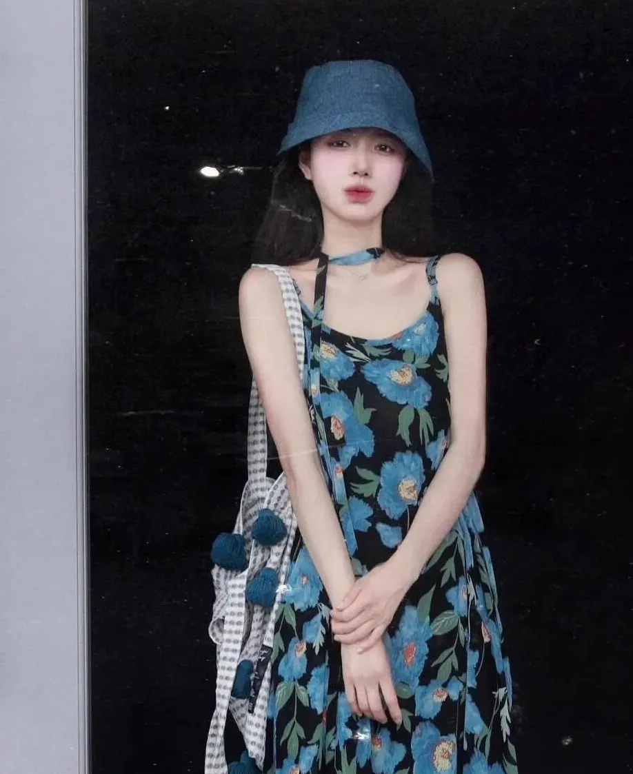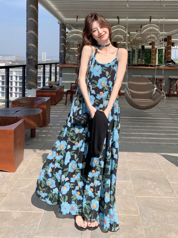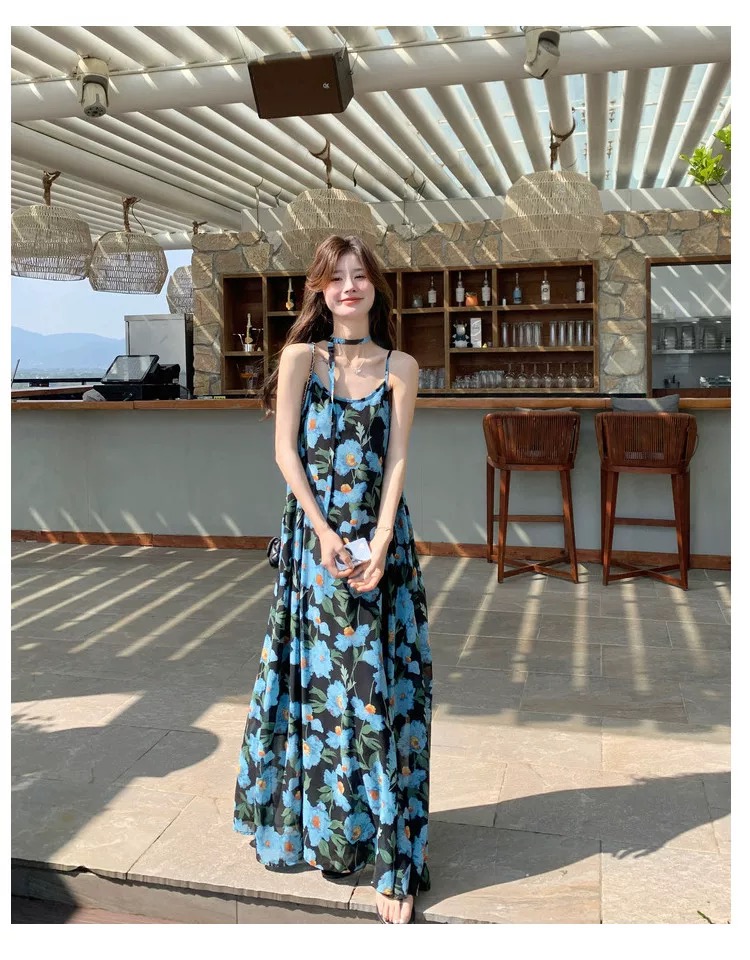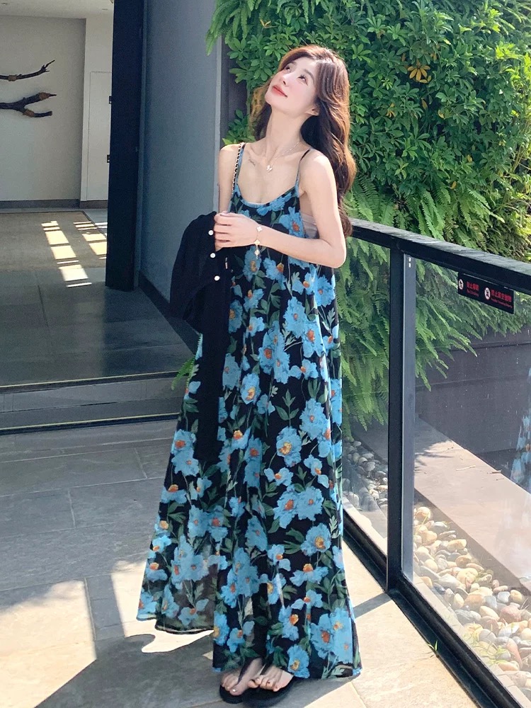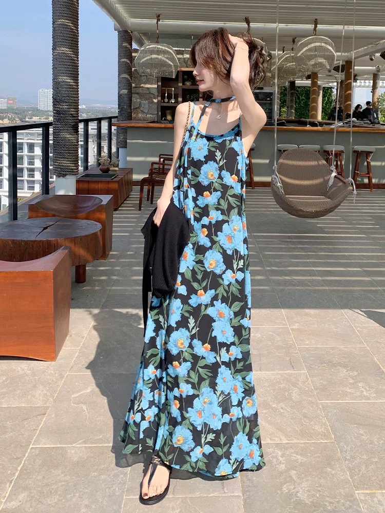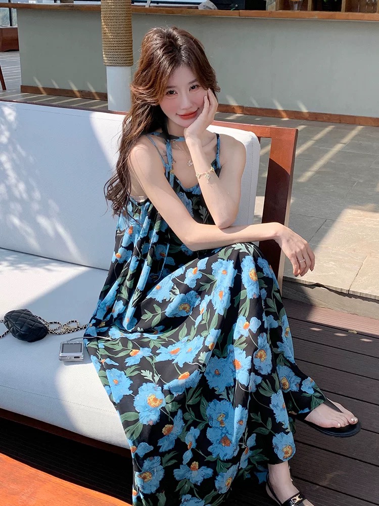 法式度假質感高級感藍色花無袖吊帶洋裝