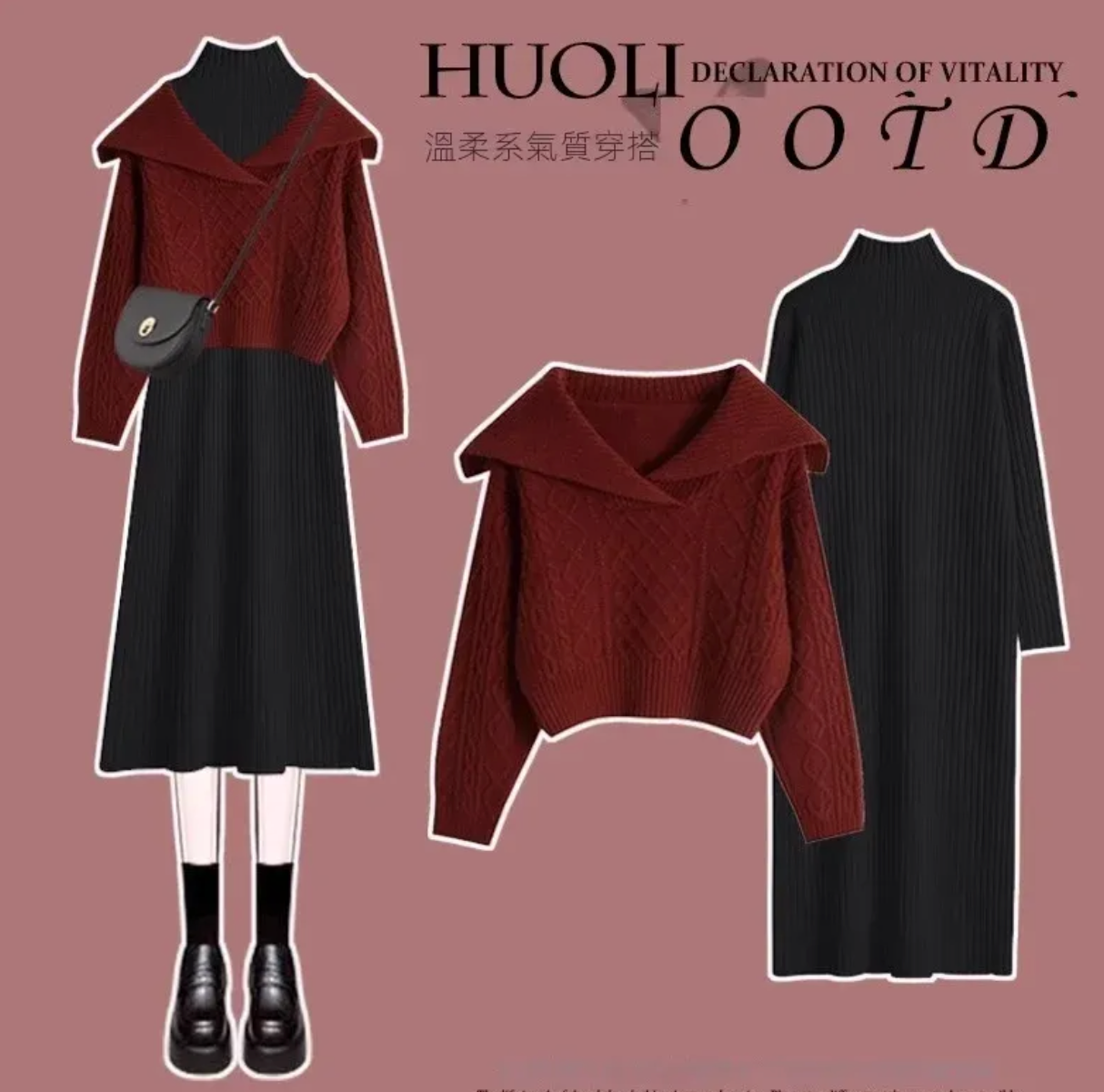 红色毛衣+黑色连衣裙【兩件套】