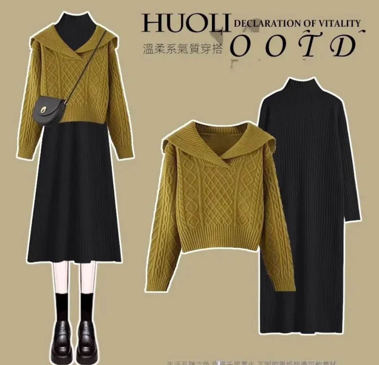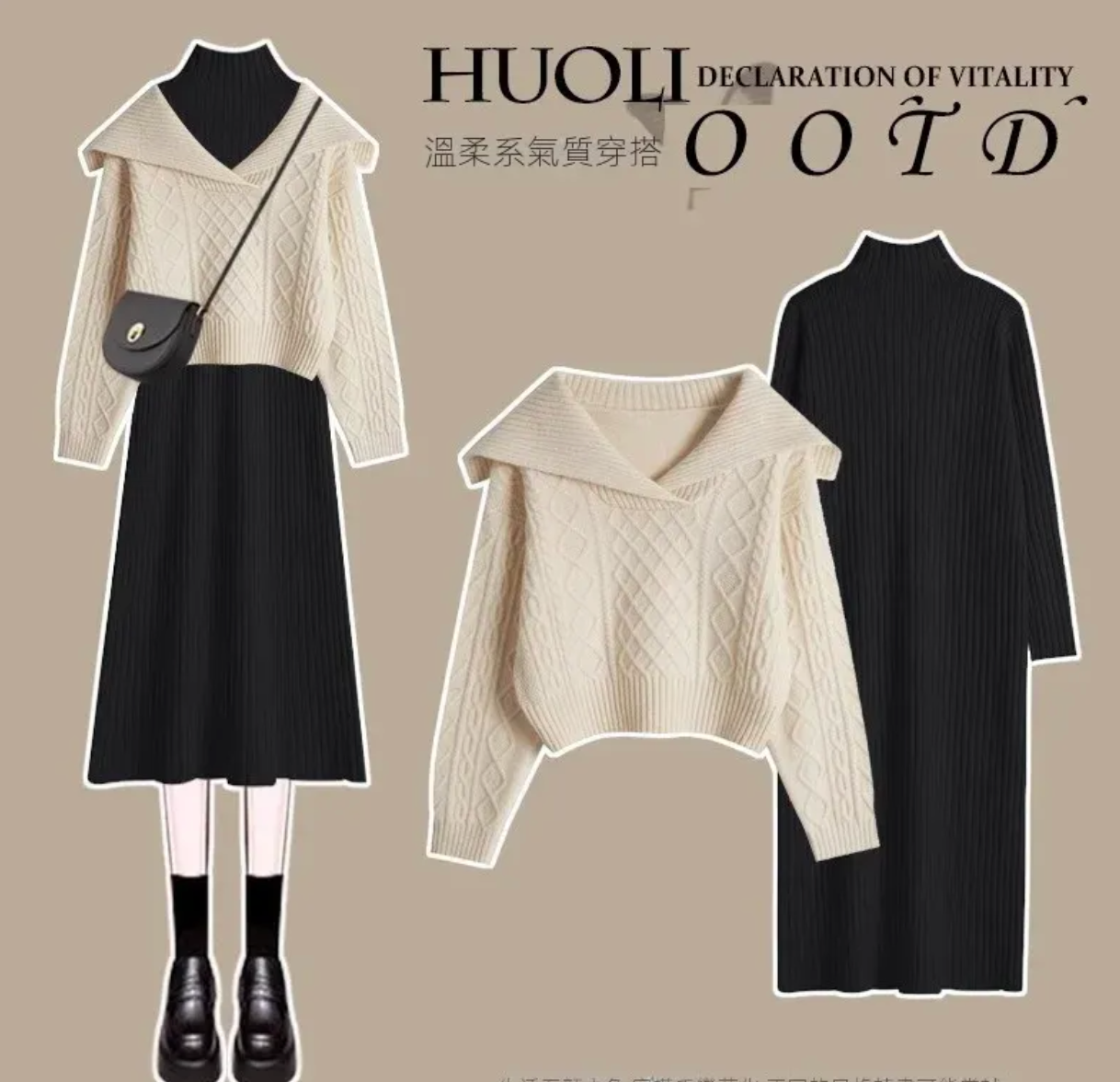 杏色毛衣+黑色连衣裙【兩件套】
