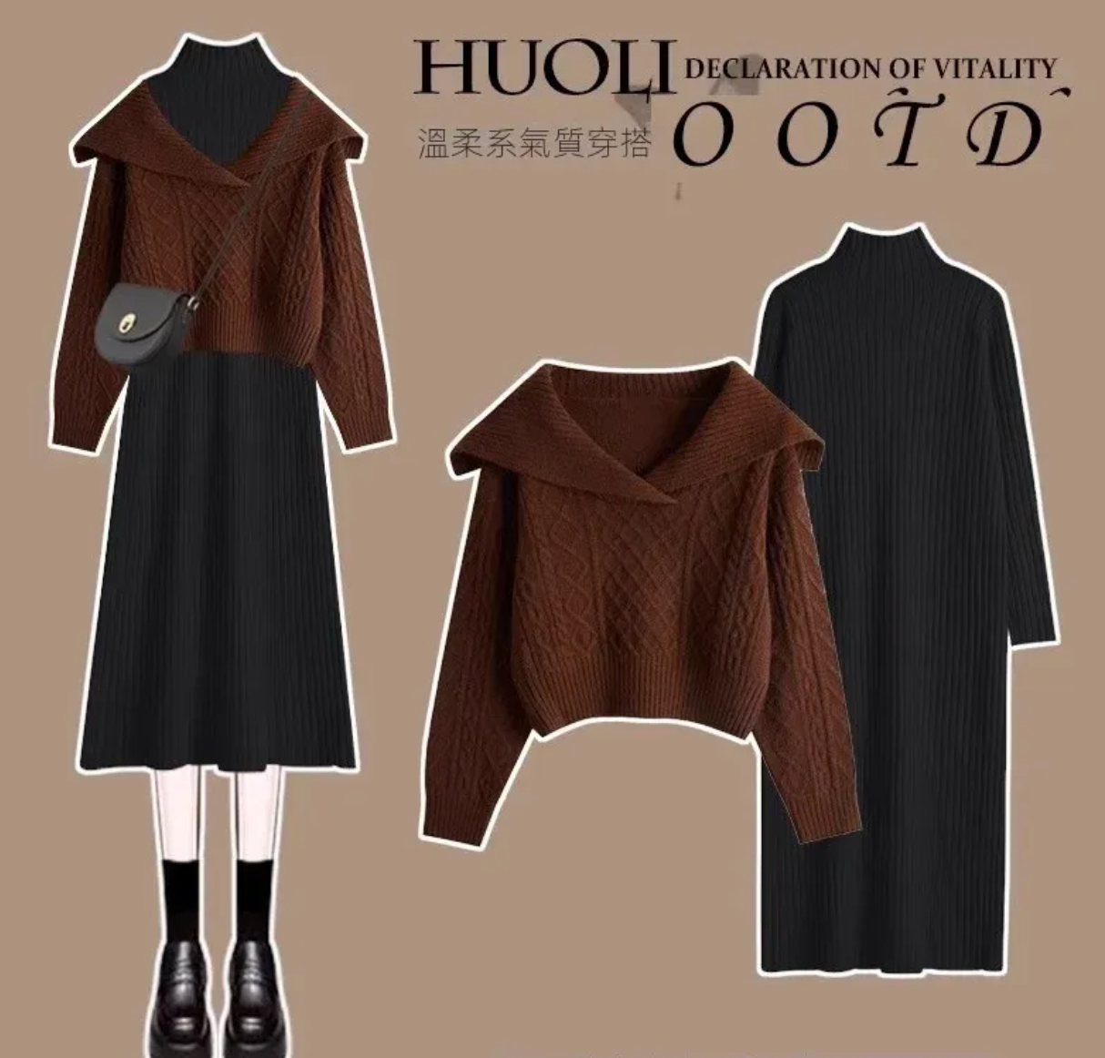 咖色毛衣+黑色连衣裙【兩件套】