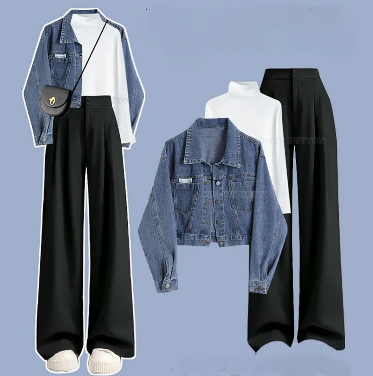 藍色外套+白打底+黑色闊腿褲【三件套】