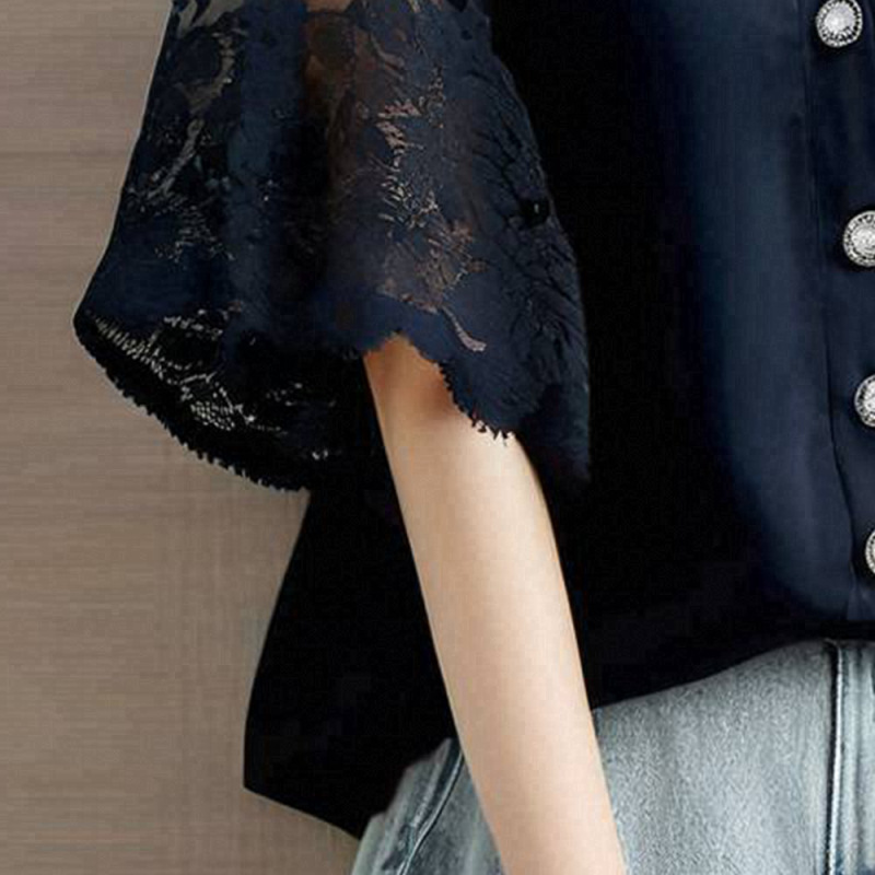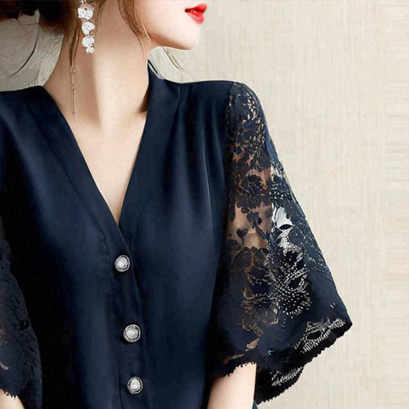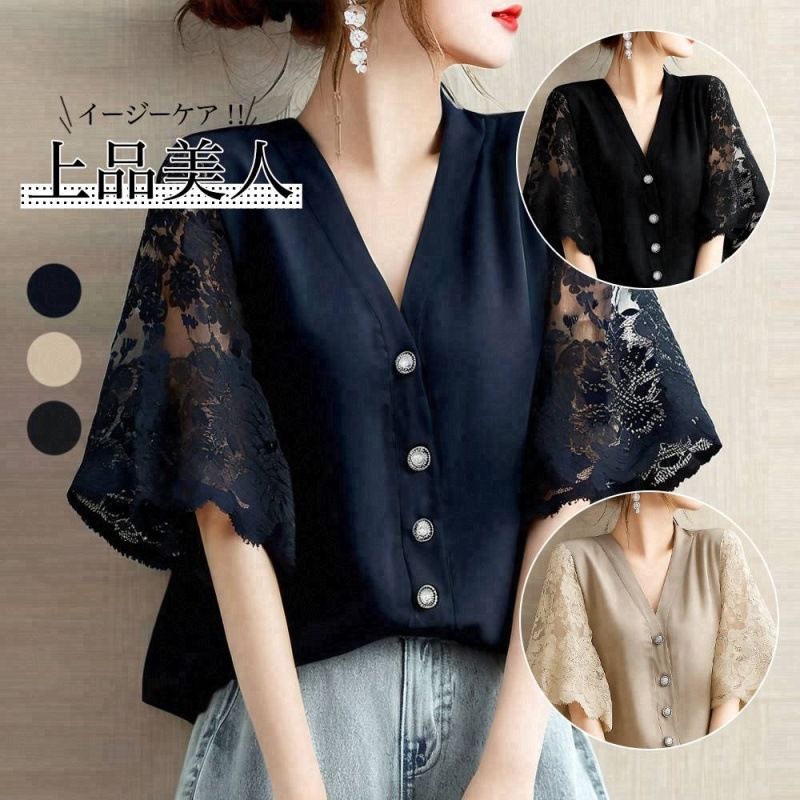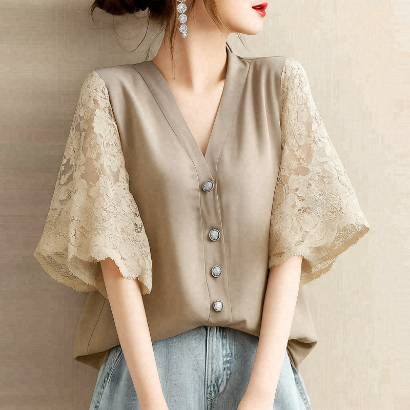 日系時尚拼接v領蕾絲氣質五分短袖