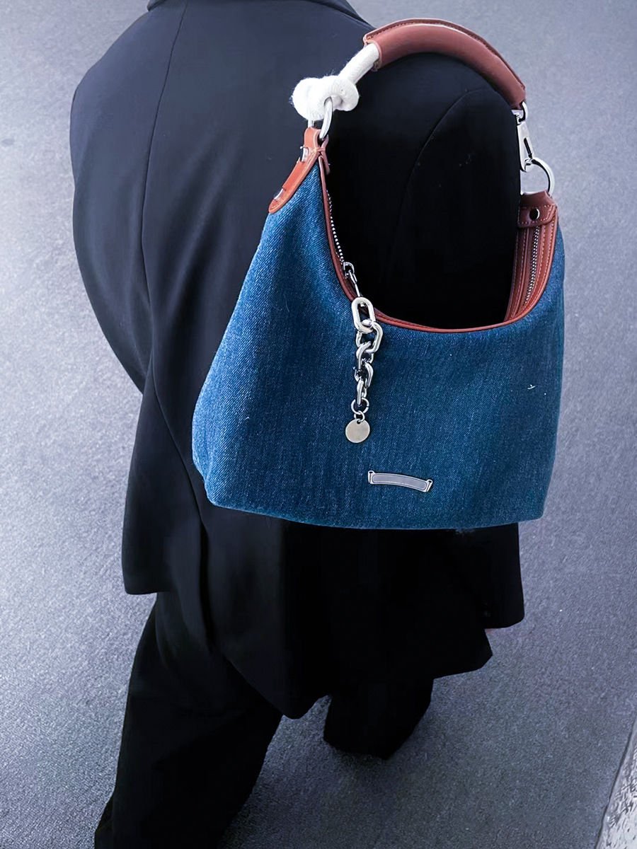 材質:牛仔布箱包潮流款式:托特包箱包大小:小流行元素:車縫線流行元素:撞色裏料質地:無裏布箱包形狀:橫款方型開蓋方式:拉鏈包內部結構:拉鏈暗袋硬度:軟外袋種類:內貼袋適用場景:日常搭配