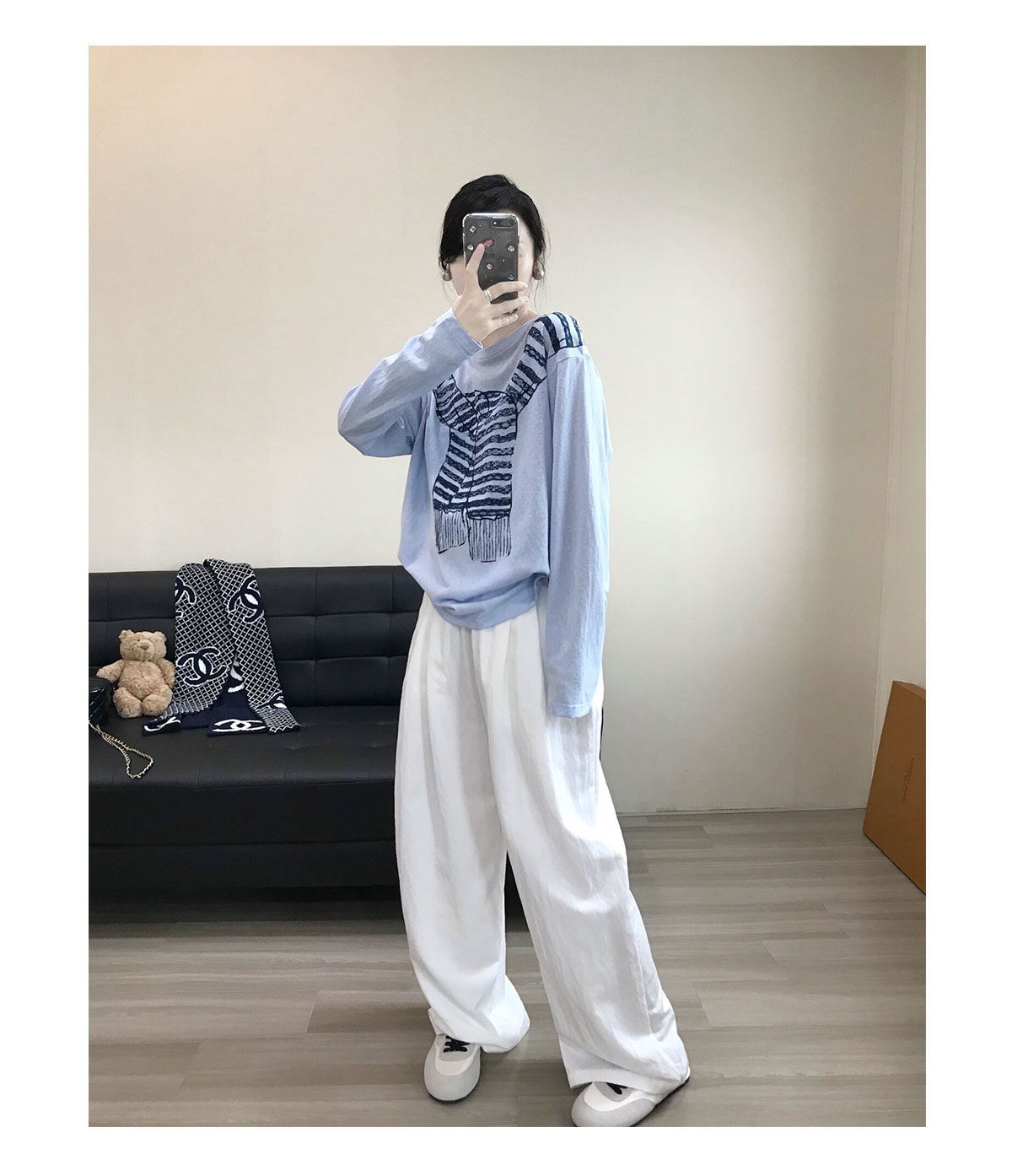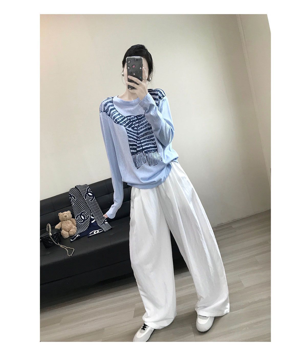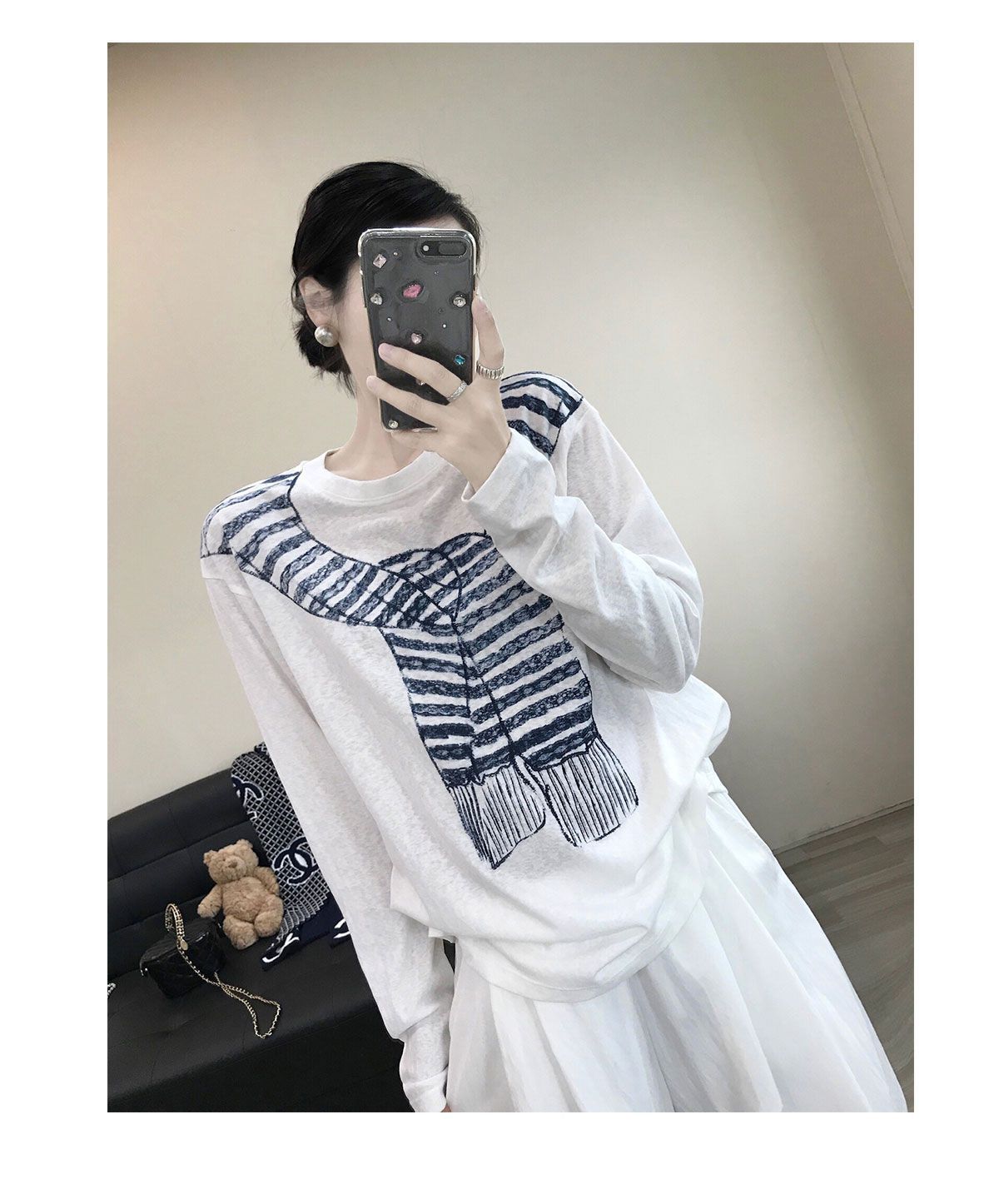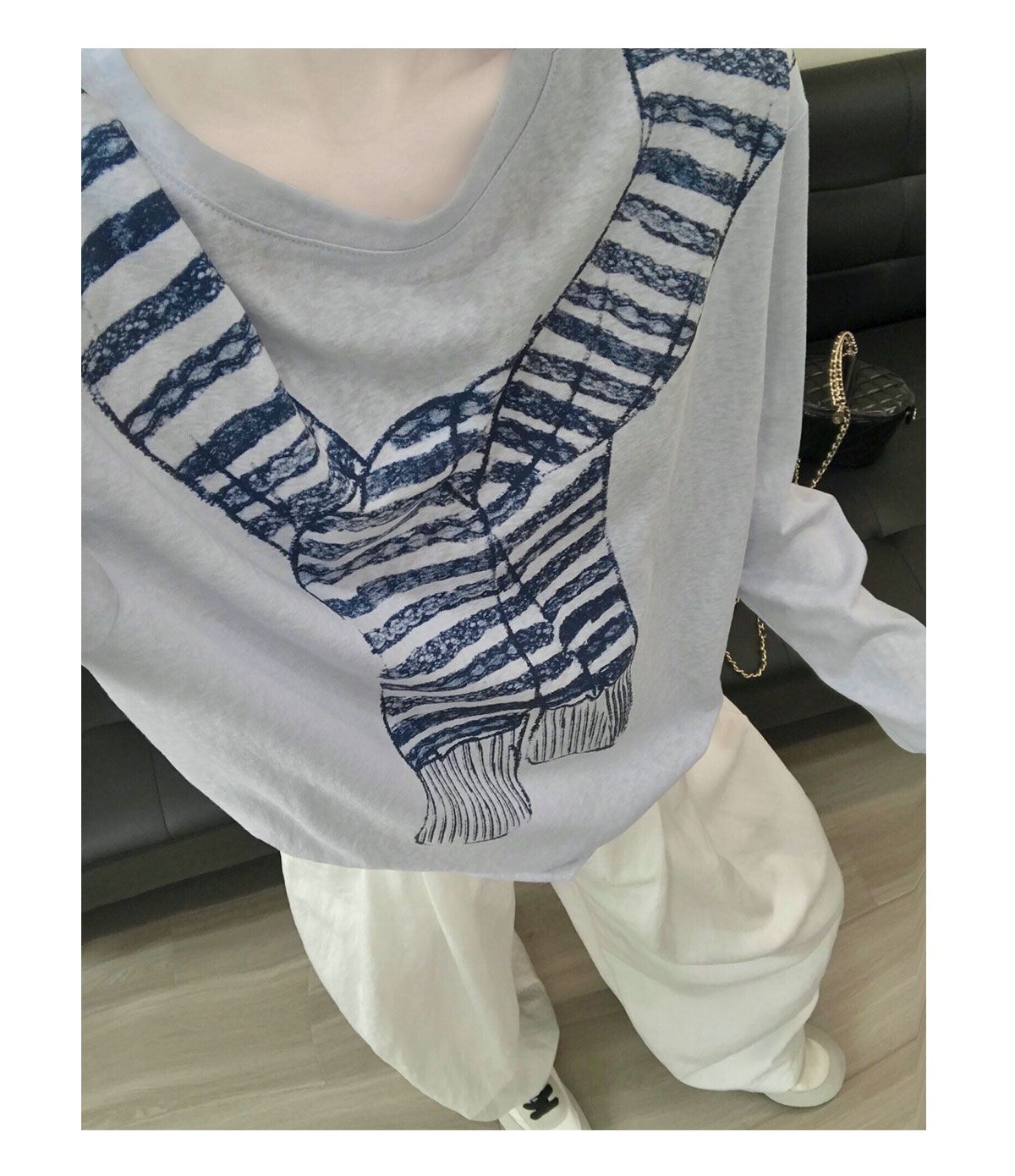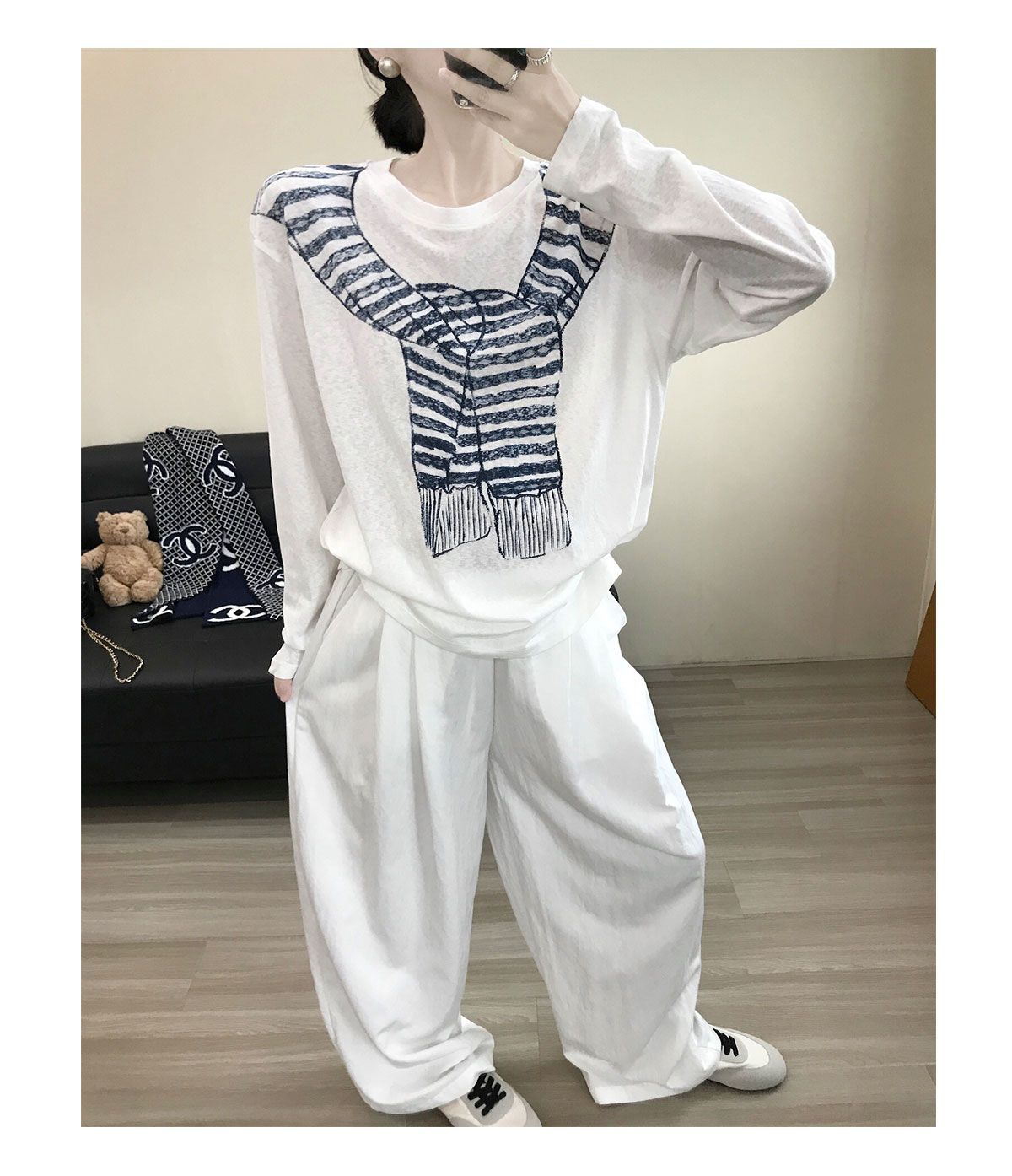 薄款寬鬆休閒百搭圍巾印花圓領長袖T恤