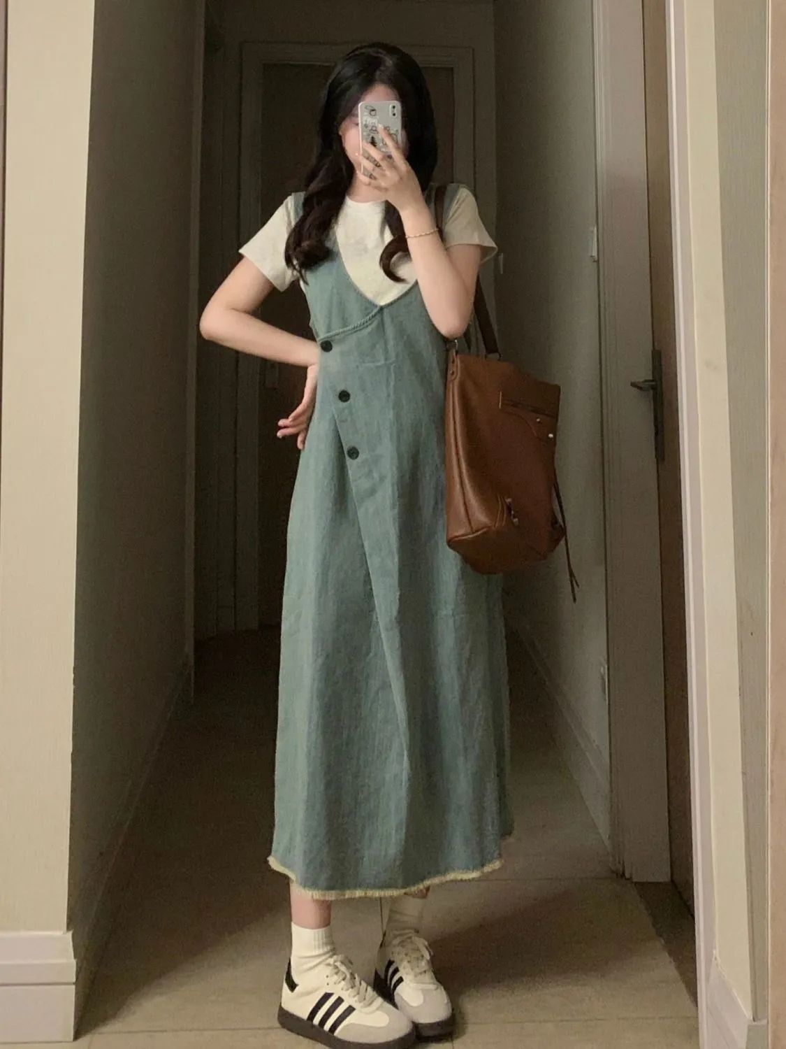 【單件/套裝】百搭短袖設計感牛仔吊帶洋裝兩件套裝