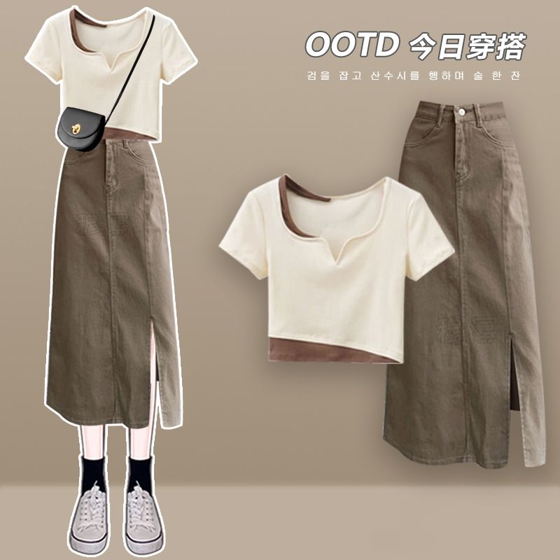 【套裝】休閒百搭潮流短袖V領+顯瘦牛仔半身裙兩件套裝