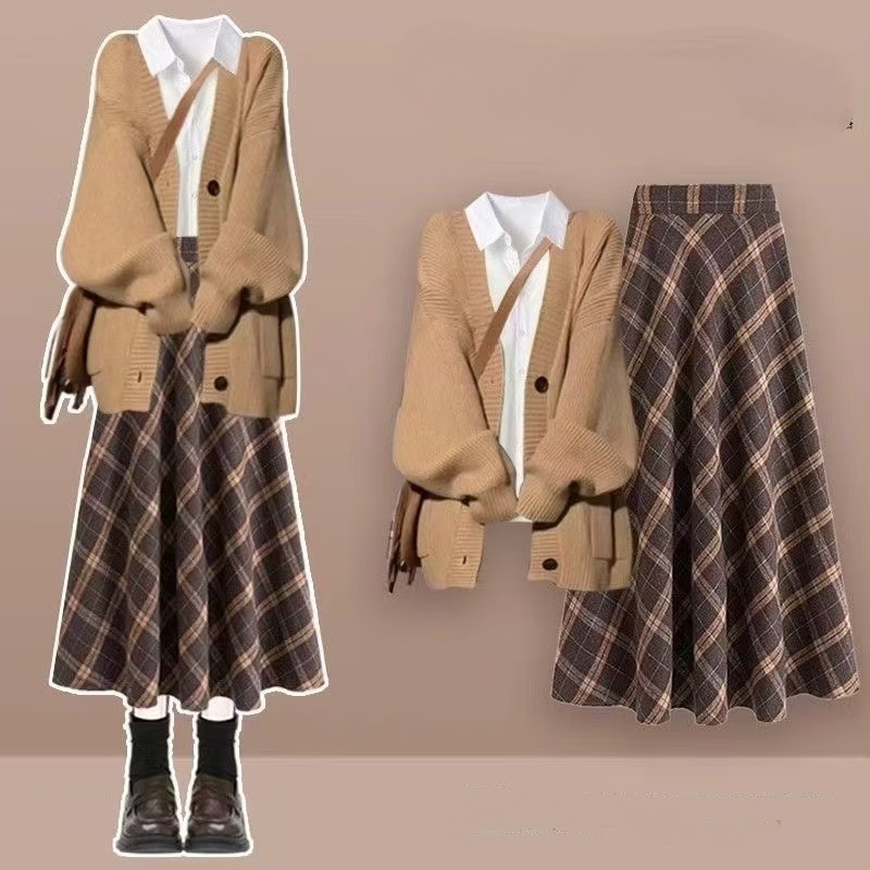 顯瘦寬鬆針織開衫襯衫內搭格子傘裙三件套裝