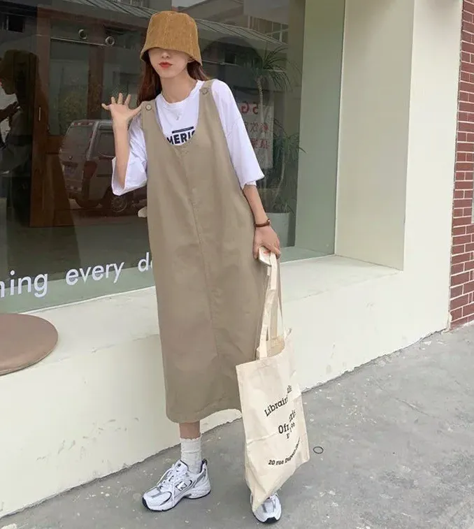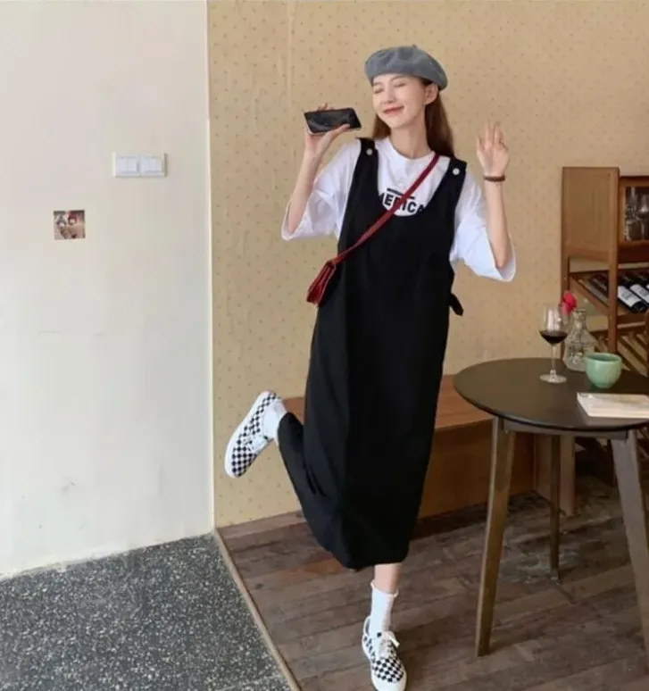 【單件/整套】日系顯瘦短袖減齡寬鬆背帶裙兩件套裝