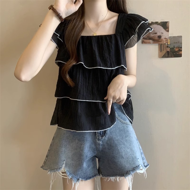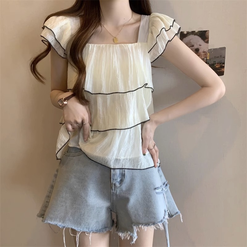 方領 荷葉邊 小飛袖 雪紡 吊帶