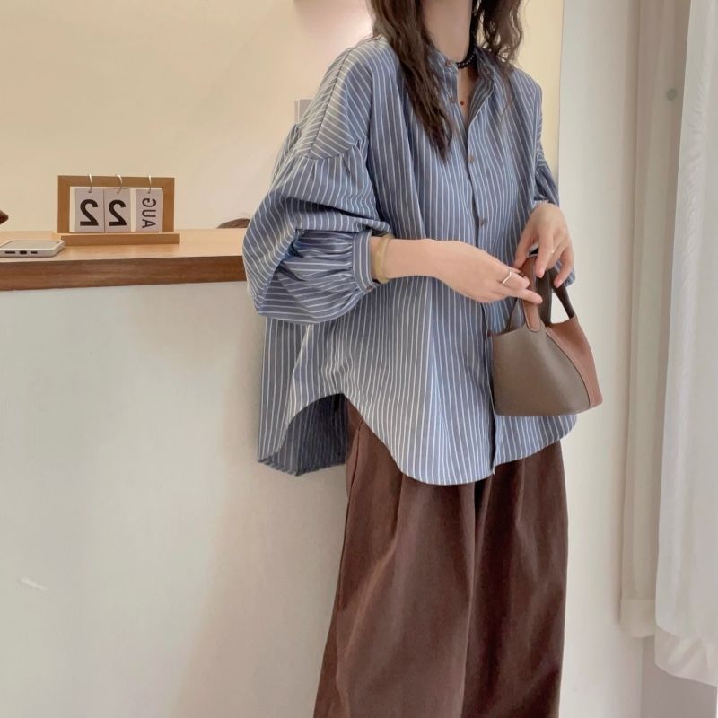 條紋燈籠袖顯瘦日系小立領寬鬆襯衫