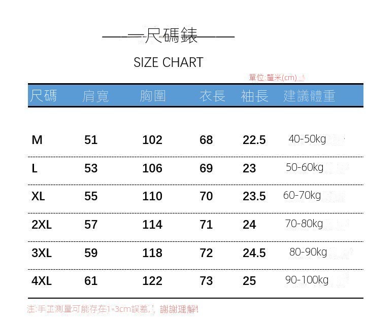 1、通常尺寸表所示數據均為平鋪测量的,尺寸測量可能會出現一些誤差約1-3cm。