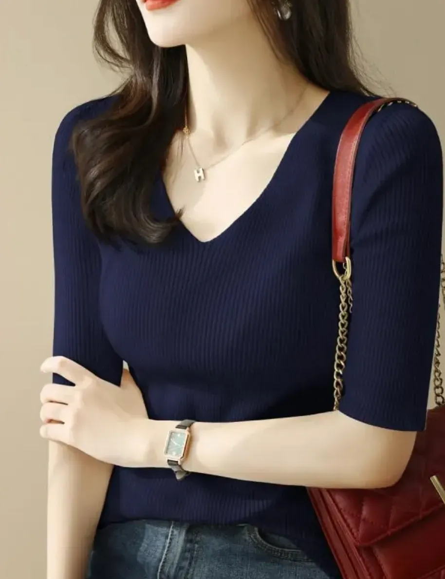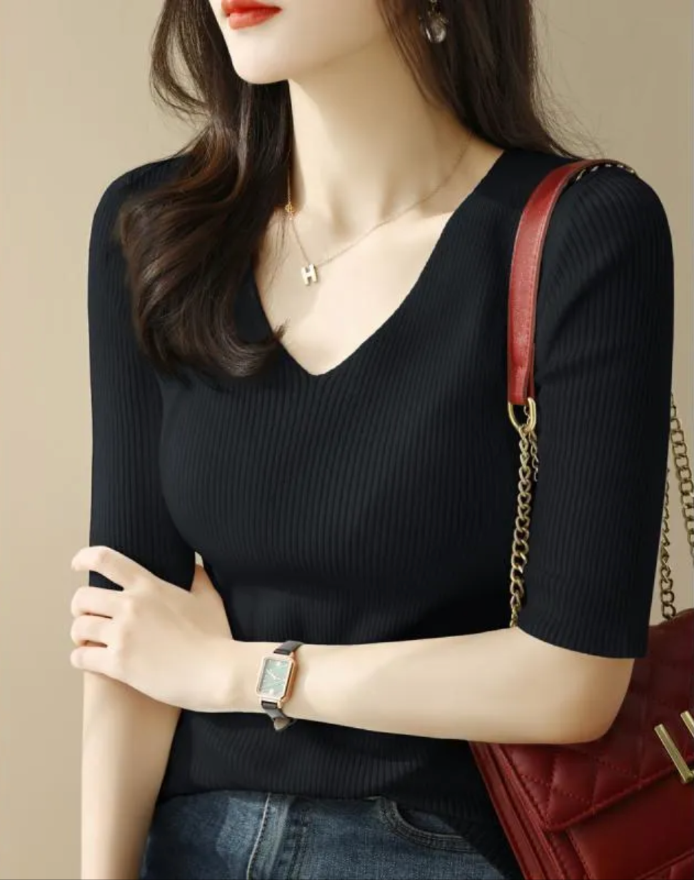 正肩V領修身針織衫五分袖T恤短袖-lululam