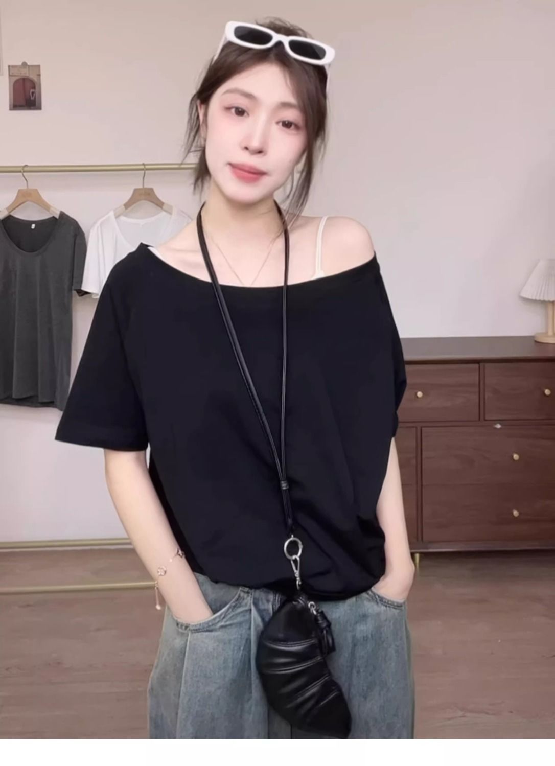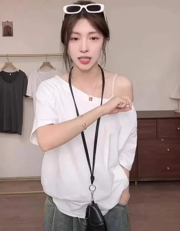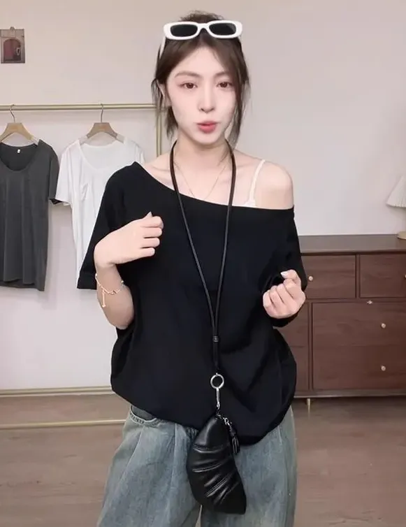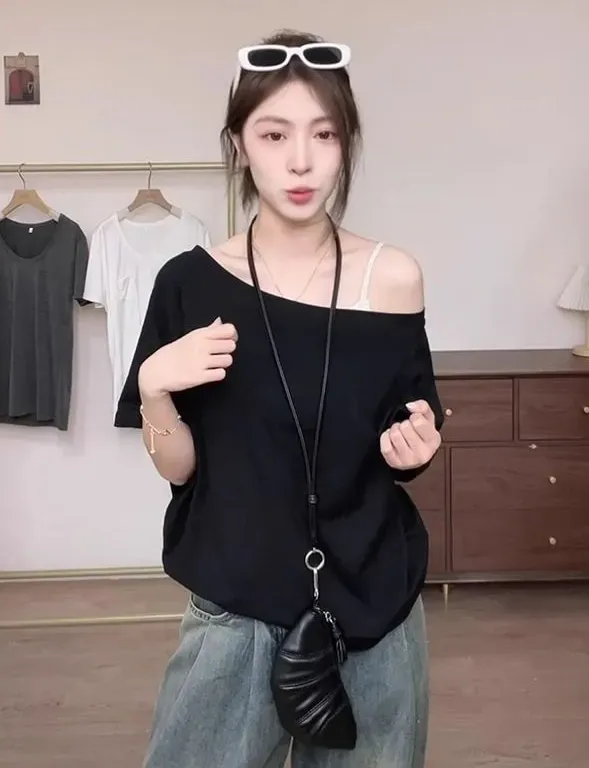 一字肩純慾斜領露肩寬鬆顯瘦短袖T恤